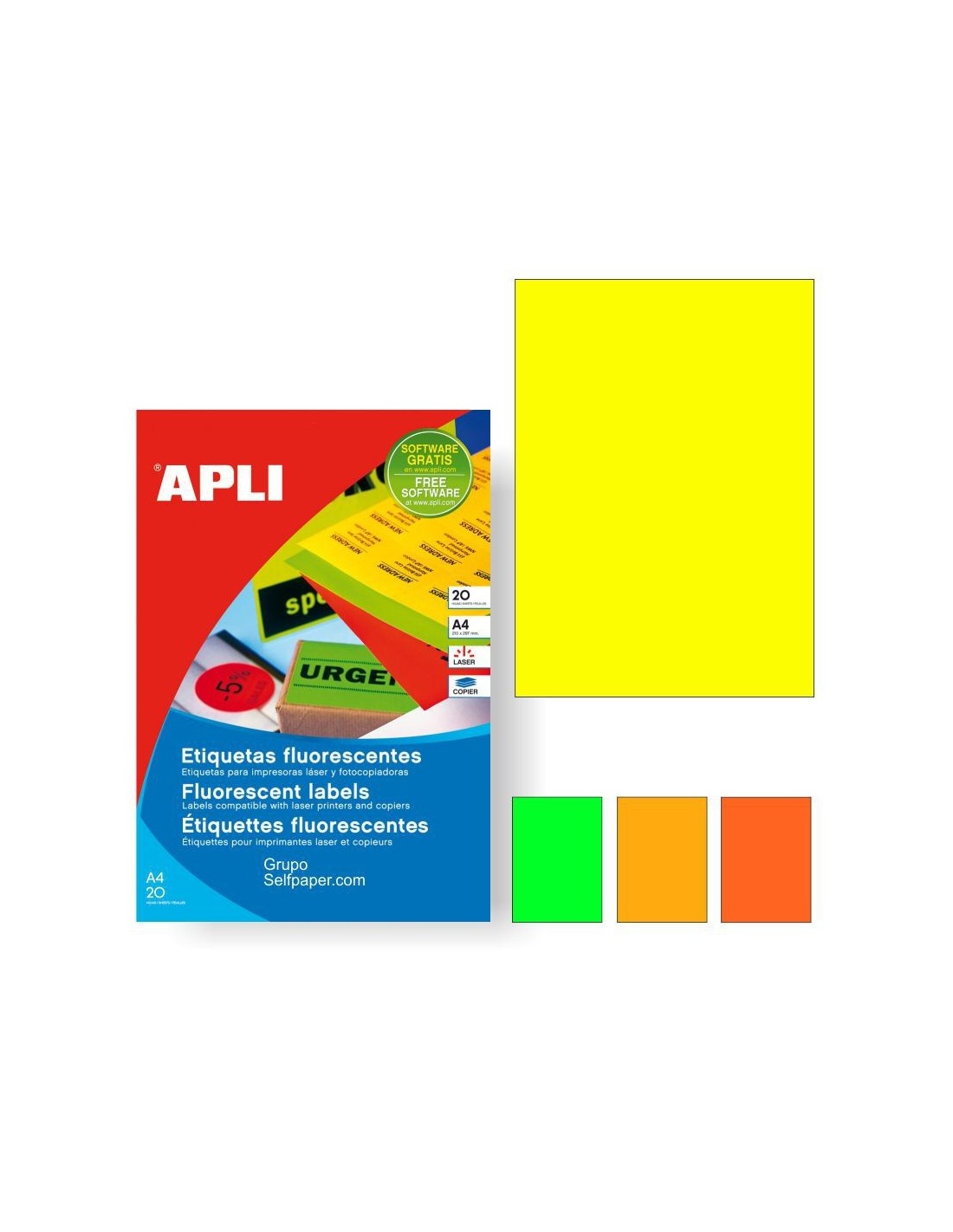 ETIQUETAS APLI LASER/COPY FLUORESCENTE 02878 210X297MM FLUOR AMARILLO 20 HOJAS