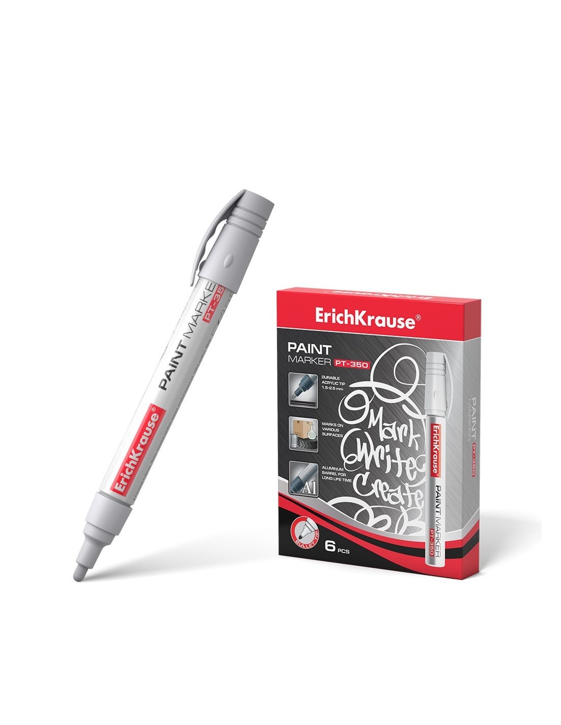 Marcador de pintura universal con sistema de suministro de tinta tipo válvula. Marcador permanente con punta en forma de bala, adecuado para escribir y marcar en casi todas las superficies: causo, metal, hormigón, papel, cartón, vidrio, plástico, porcelana, madera, piedra artificial y natural, etc. Ancho de escritura:1,5 - 2,5mm. No es tóxico. Con contiene xileno ni tolueno.