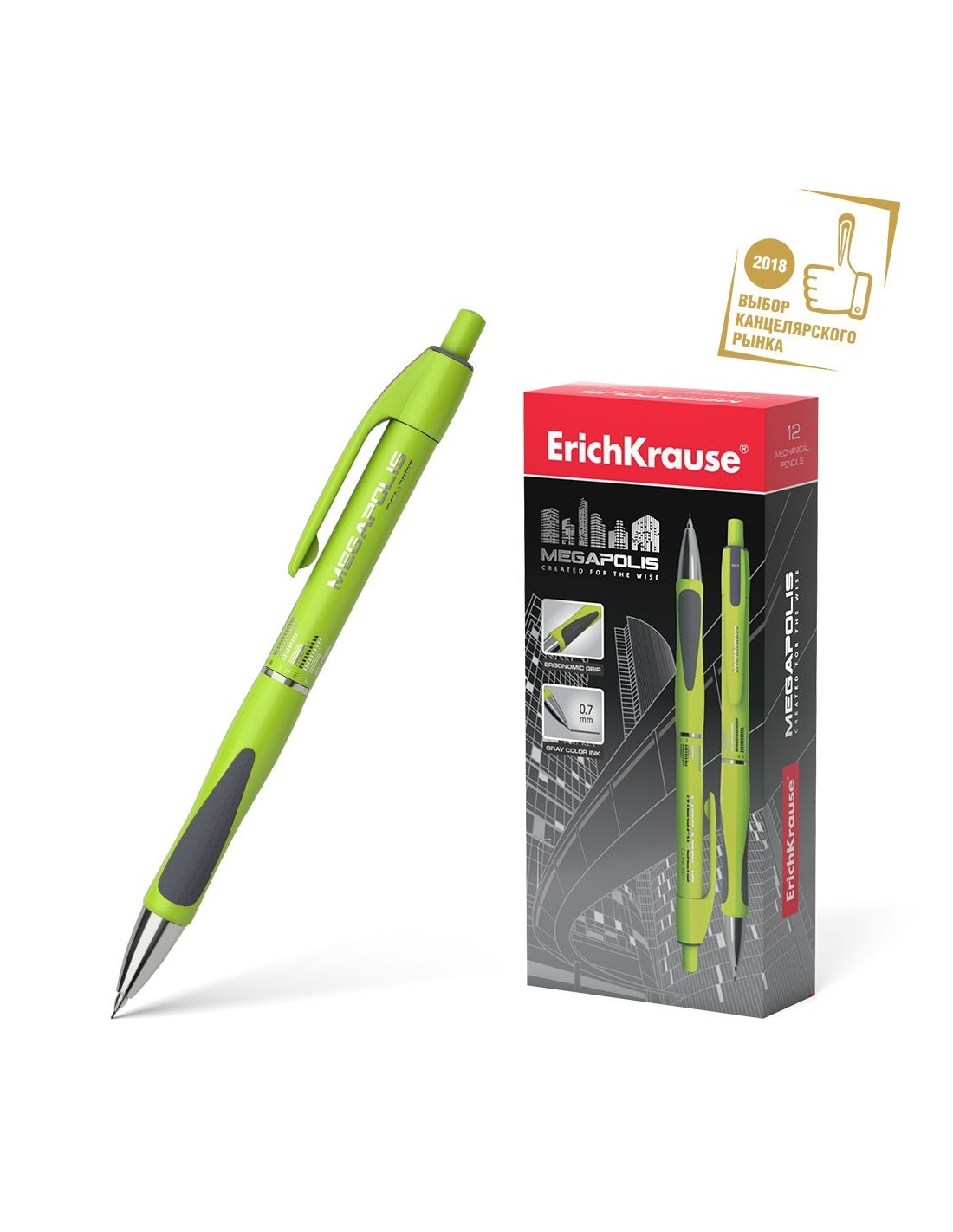 Lápiz mecánico con punta de metal y boquilla retáctil. Cuerpo redondo y neón, con zona de agarre ergonómica equipada con dos bordes de goma. Dureza HB. Minas de 0,7mm de diámetro.